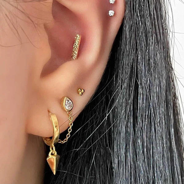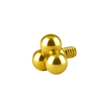 Topp till piercing i äkta guld. Piercingsmycket har ett motiv av tre små kulor och passar till 1.2 mm invändigt gängade stavar med gängor på 0.8 mm.