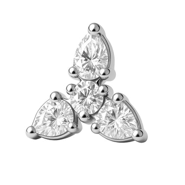 Trinity med vita stenar, tillverkad i allergivänligt G23 titan. Passar stavar på 1.2 mm med 0.9 mm-gängor. Perfekt för känsliga piercingar.