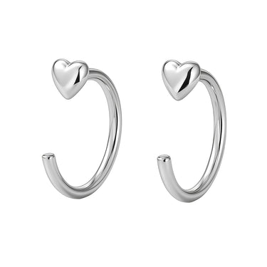 Silverörhängen i smal design. De tunna ringarna pryds av ett hjärta på framsidan. Ringar till öronen som är enkla att använda.