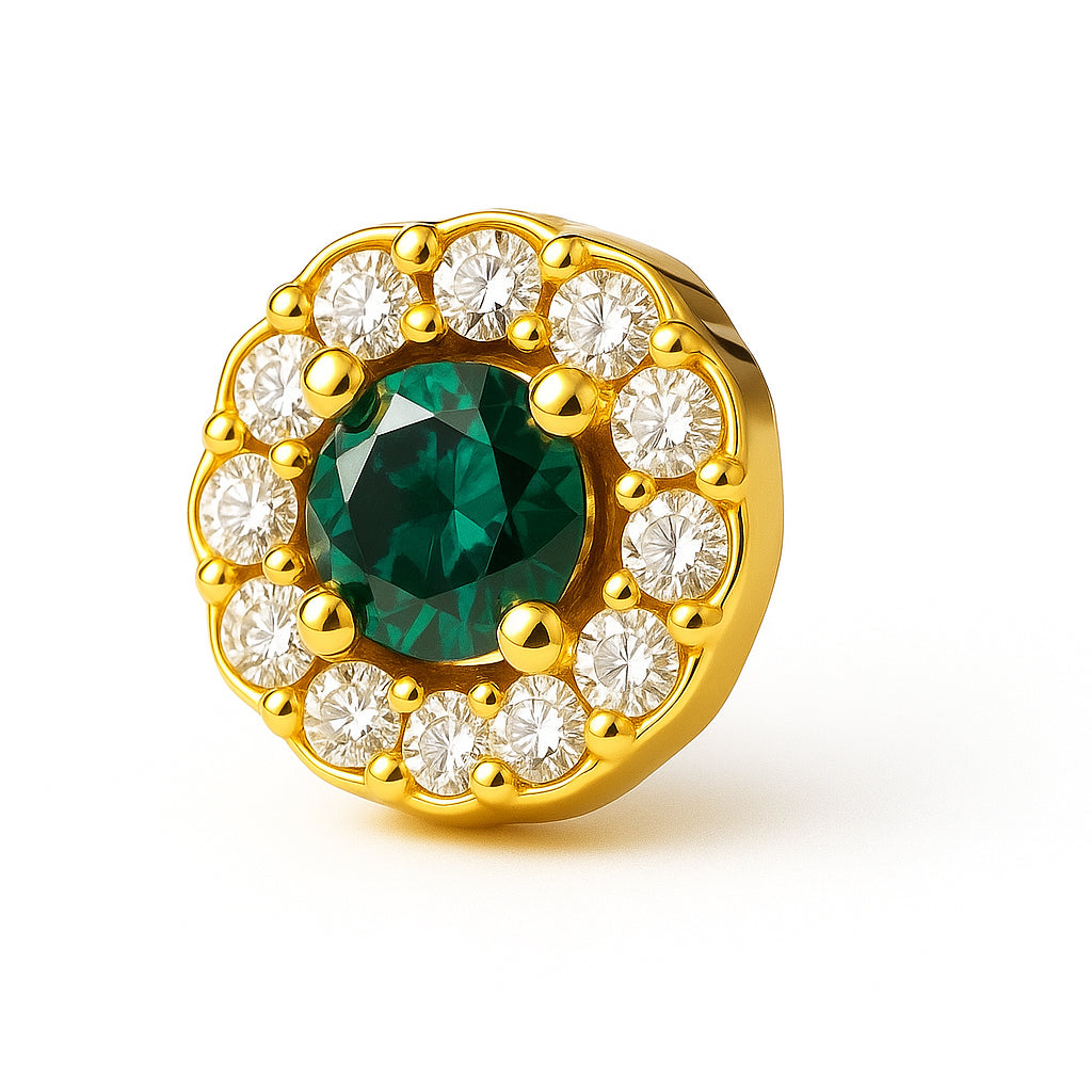 Denna exklusiva cluster-topp kombinerar lyx och funktion med sin 18k PVD guldplätering och gnistrande grön och vita cubic zirconia-kristaller. Tillverkad av nickelfritt kobolt-krom är smycket allergivänligt och tål både dusch och bad, vilket gör det idealiskt för vardagsbruk. Toppens storlek, 6x6 mm, är perfekt för stavar med 1.2 mm tjocklek och 0.8 mm gängor. Ett lyxigt piercingsmycke för dig som vill ha både elegans och hållbarhet. Säljs styckvis – stav köps separat.