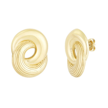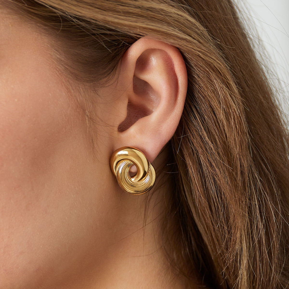 Unika stiftörhängen i en sammanflätad design med både släta och strukturerade ytor. Tillverkade i nickelsäkert kirurgiskt stål med 18K PVD-guldplätering för vattentålig hållbarhet.
