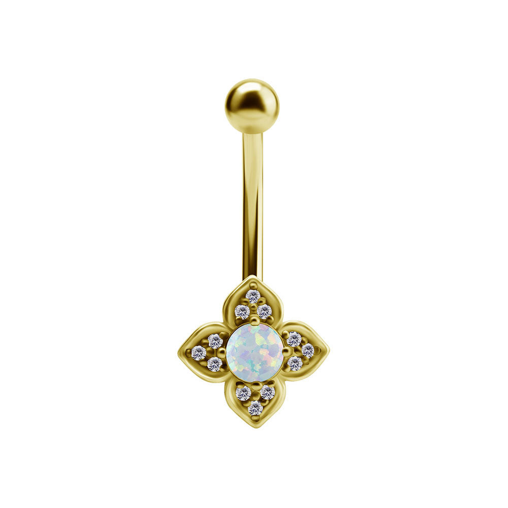 Supersnyggt navelsmycke med motiv av en blomma i nickelsäkert kirurgiskt stål med en opalit i mitten. Smycket är förgyllt med vattentålig PVD guldplätering som ger en exklusiv känsla och långvarig glans.
