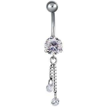 Navelsmycke i kirurgiskt stål med kedjor och kristaller.