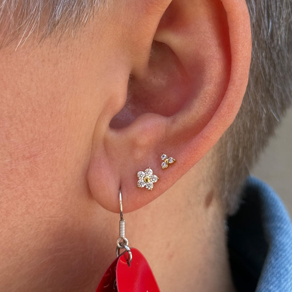 Låt din piercing blomstra med denna stilrena och glittrande topp i form av en blomma med fem kristallblad. Tillverkad i högkvalitativt G23 titan, pläterad med 18k guld genom PVD-teknik för maximal hållbarhet och vattenresistens – perfekt för daglig användning, även i dusch och bad. Med en storlek på 6 x 6 mm är denna eleganta detalj både iögonfallande och subtil, vilket gör den idealisk för dig som vill ha något både exklusivt och bekvämt. Passar stavar med 1.2 mm tjocklek och 0.9 mm gängor – se rekommenderad stav nedan.