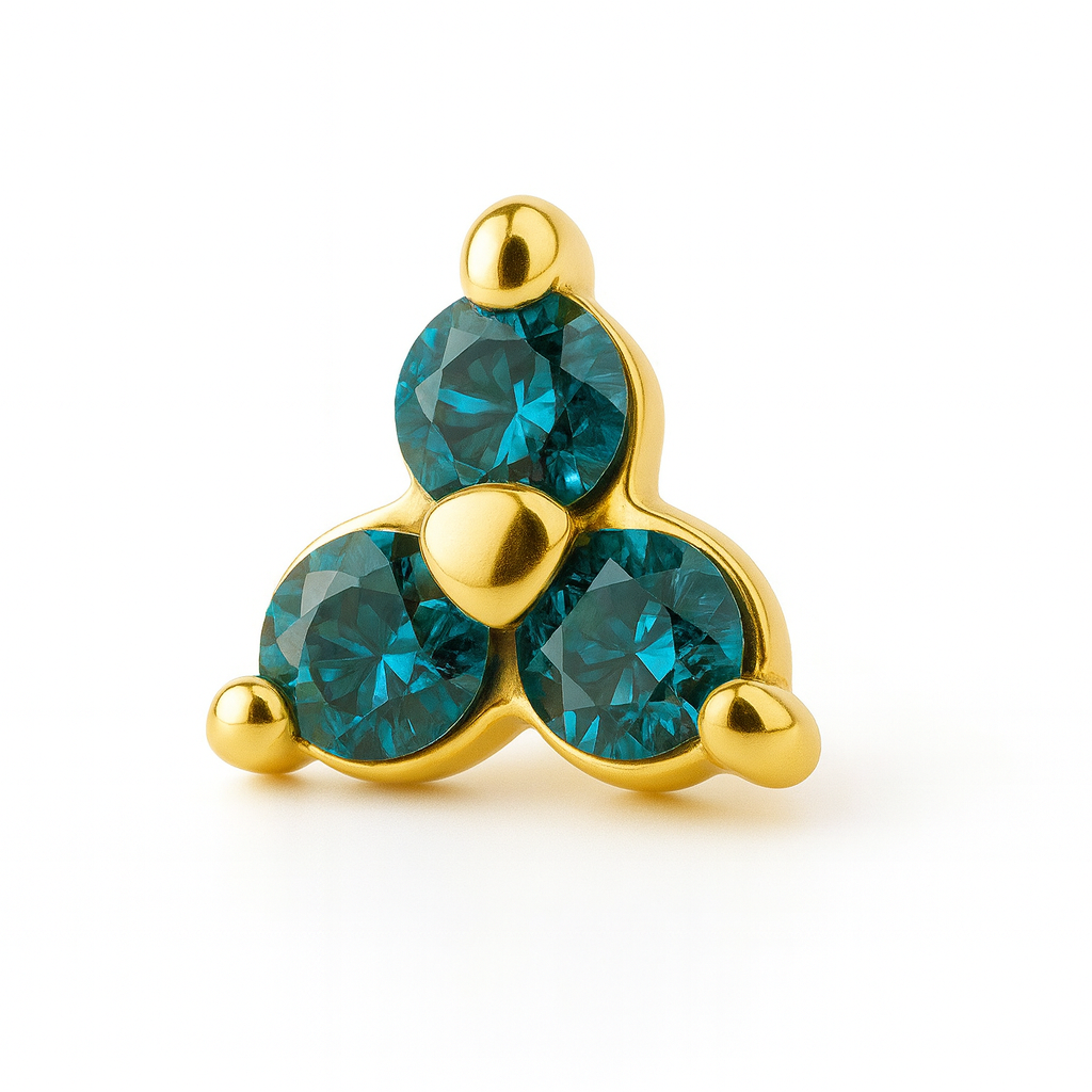 Denna Trinity-piercingtopp med gröna kristaller kombinerar stil och funktion. Tillverkad i nickelfritt kobolt-krom och pläterad med 18k PVD-guld, ger den en tidlös elegans samtidigt som den är slitstark och vattentålig. Perfekt för dagligt bruk och helt allergivänlig. Med sina 3.5 x 3.5 mm passar den stavar på 1.2 mm med 0.8 mm gängor. Ge din piercing ett sofistikerat uttryck med denna exklusiva detalj.