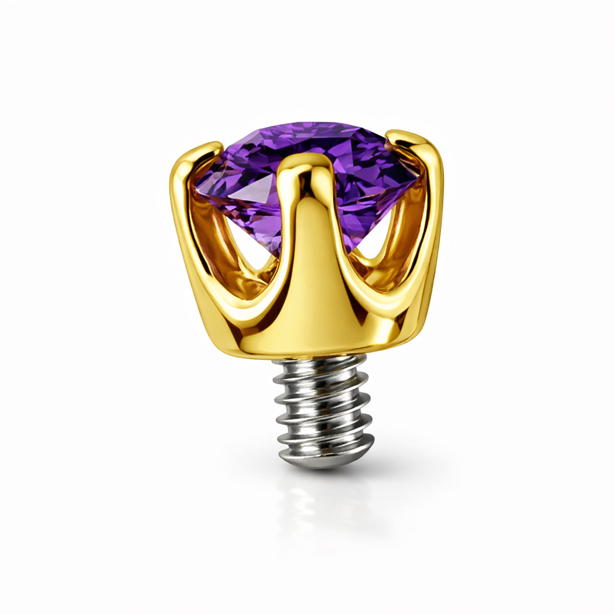 Topp till piercing med kloinfattad lila kristall. Piercingsmycket är av högsta kvalitet och gjort i nickelfritt, allergivänligt och vattentåligt 18 karat äkta guld. Passar 1.2 mm invändigt gängade stavar med 0.8 mm gängor.