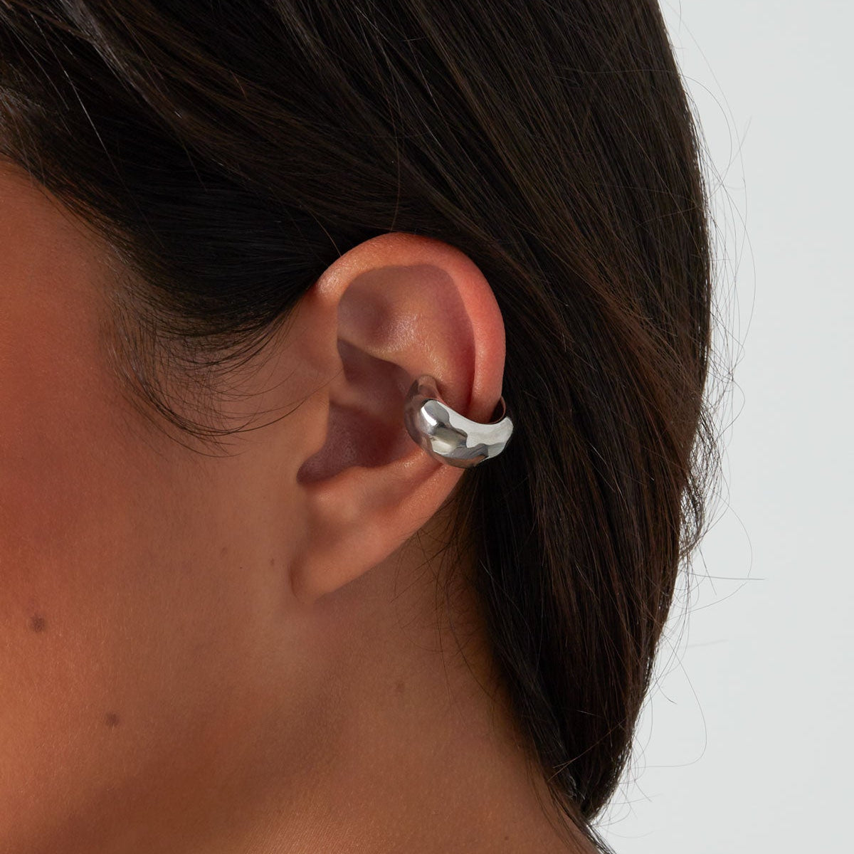 Denna ear cuff har en rund och kraftfull form med bred design. Konstruktionen gör att smycket enkelt träs på runt conchområdet utan hål i örat.