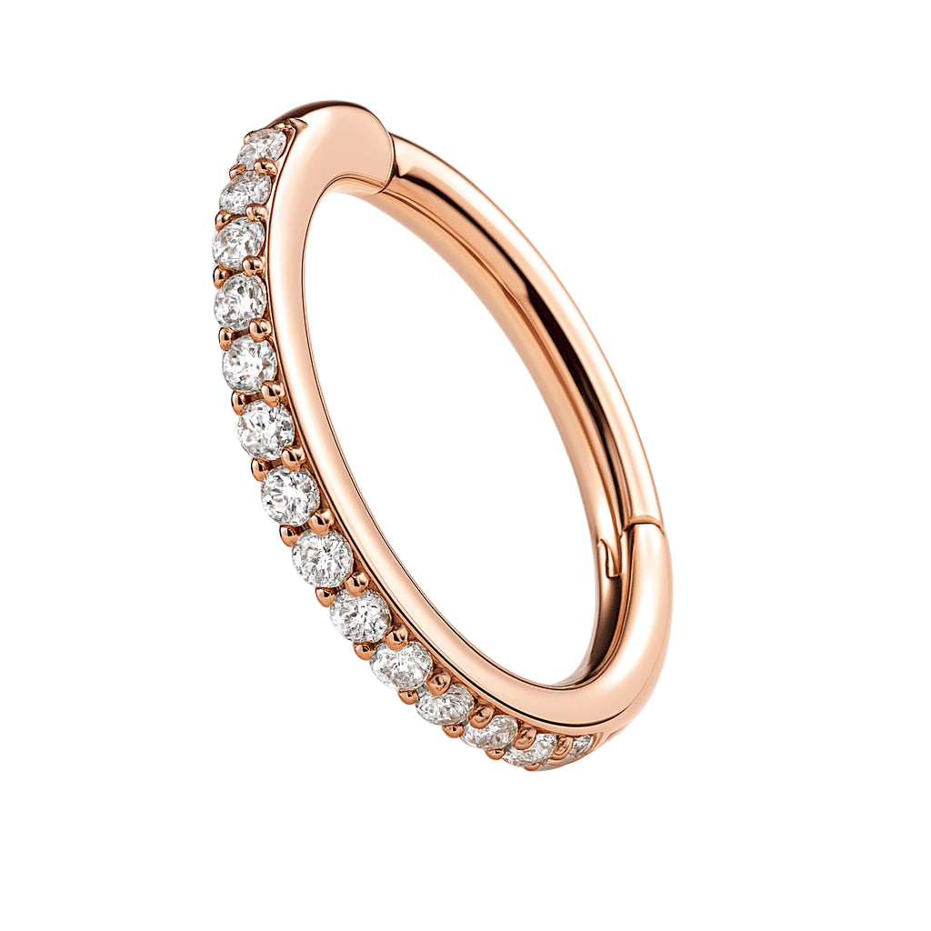 Piercingsmycke - Tunn ring i roséguldpläterat kirurgiskt stål med vita kristaller. Ringen öppnas och stängs med klickfunktion och är enkel att byta.